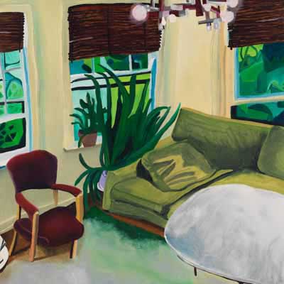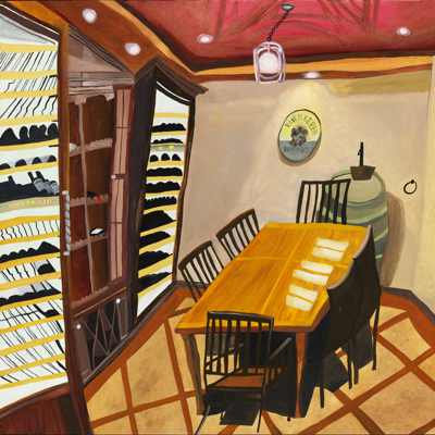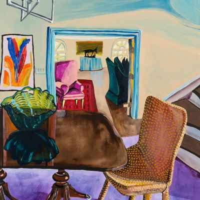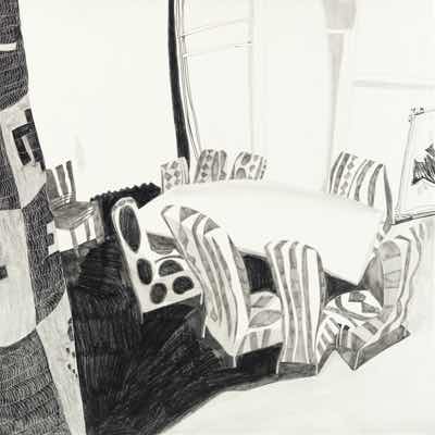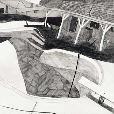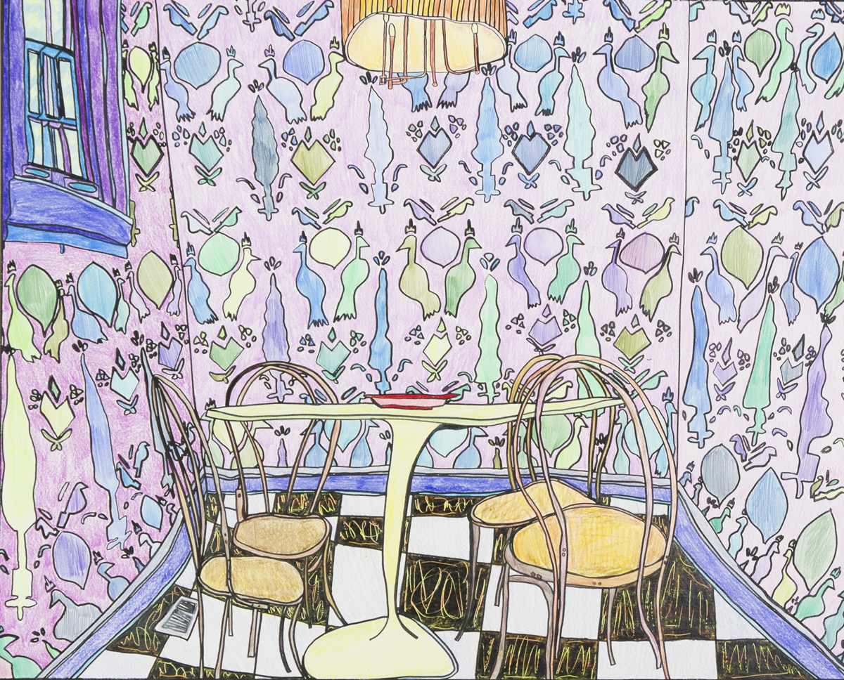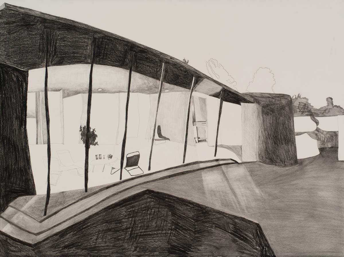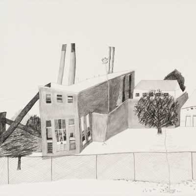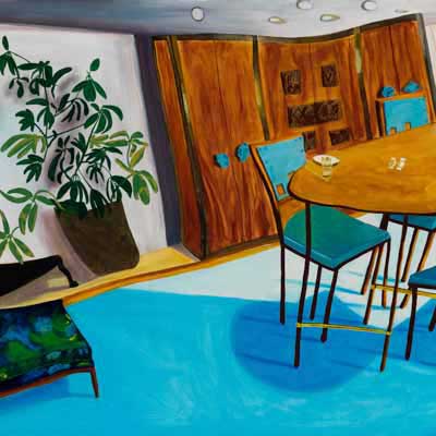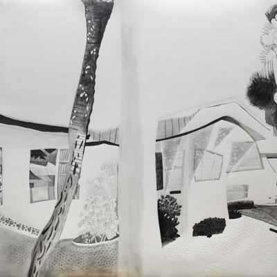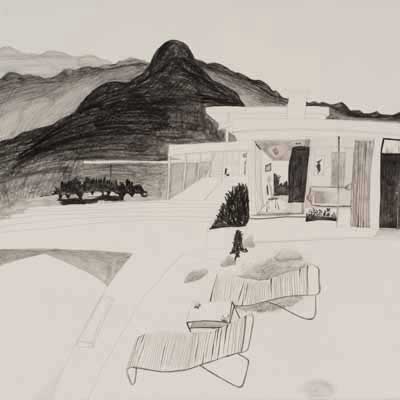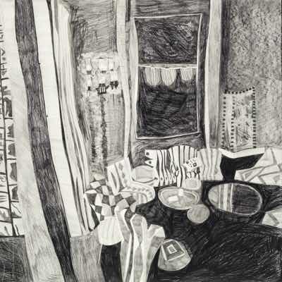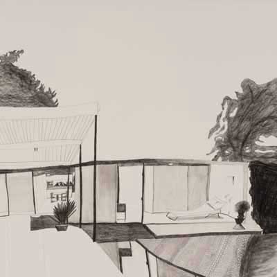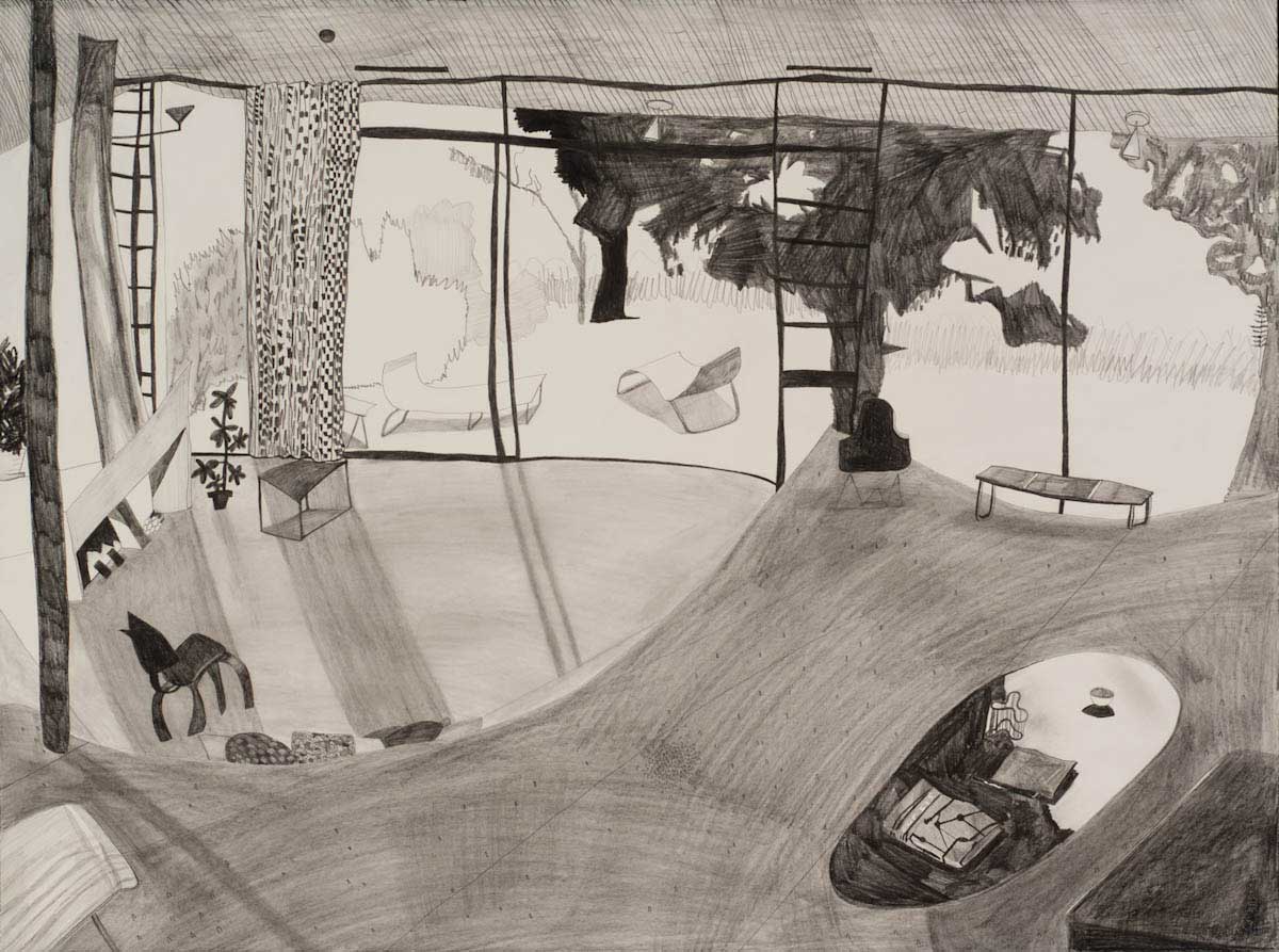 Gallery-Ox-Bow Centennial: Historic. In the East Wing of the gallery, CvsD spotlights new work by Chicago artist Gabrielle Garland. Garland’s intimate paintings focus on interior spaces – brilliantly colored, delightfully warped unpopulated domestic scenes. Her larger, slightly Hockneyesque graphite drawings feature landscape and architecture, with a dazzling range of marks from wild and expressionistic to fastidious and precise.